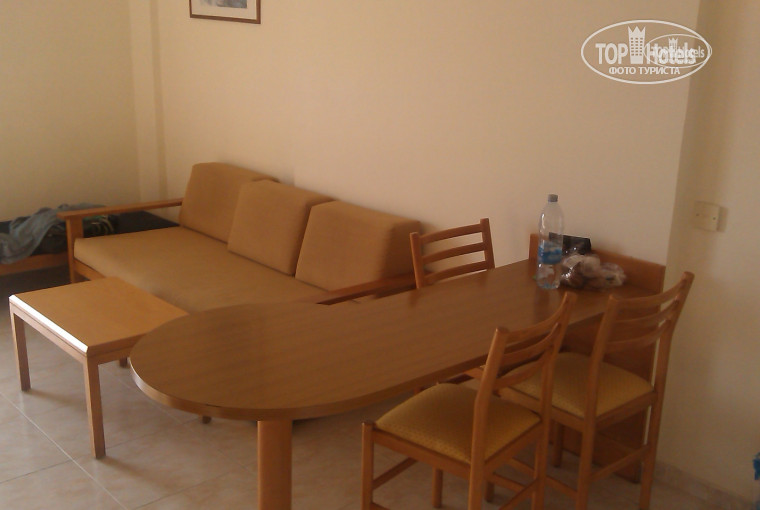 Отдыхали в данном отеле с супругой 05.10 - 14.10.2016 (нам 28 и 30 лет). Прибыли в 21:00, в номере были уже через 5 минут после приезда. Номер достался на 4 этаже (№ 413) с видом на внутренний двор с бассейном и на море. Апартаменты просторные, состоящие из кухни-гостиной с выходом на балкон, где ловил Wi-Fi, спальни с огромной кроватью, санузла. Есть всё необходимое: холодильник, чайник, эл. плита, столовые приборы, телевизор, кондиционер, сейф. Кондиционером и сейфом не пользовались (они платные), т.к. не было необходимости. В комнатах всегда было прохладно, солнце светило в окна только до 12 часов. На ресепшен брали 2 адаптера для розеток под депозит - 2 евро за штуку. 4 евро вернули при выезде из отеля. Также на стойке регистрации можно взять утюг и фен. В номерах прибирались каждый день, но, видимо, не охотно. Пол мыли только в центре комнаты, постельное белье за 9 дней меняли 1 раз. нас, в принципе, это не напрягало. По углам с лупой мы не ползали, каких-то недочетов не искали, просто наслаждались отпуском. Иногда на полу встречались маааааааленькие муравьи, но отдыхать они не мешали и вроде бы ничего у нас не стащили) Все продукты мы убирали в холодильник. Про питание ничего сказать не могу, т.к. тур был без питания. Расположен отель в 15 минутах ходьбы от моря, в 20-25 минутах от супермаркета "Lidl", где мы всегда закупались продуктами. Добраться до "Lidl" можно выйдя из отеля на рядом проходящую дорогу, повернуть налево, и идти по прямой (в направлении, как идти к морю и центральной улице Протараса), никуда не сворачивая. Цены в "Lidl" самые приемлемые из всех маркетов, в которых мы были. А объехали мы много мест, когда арендовали авто. Единственное алкоголь лучше покупать в оптовом супермаркете напротив отеля, сразу через дорогу. Алкоголь там самый дешевый. Выбор очень большой и дешевле даже чем Duty Free!!! Пляж "Врисси", на котором мы в основном отдыхали, - чистый, везде песочек, отличный вход в море, волн практически никогда не было, а если и были, то не большие, в отличие от других курортов (Айя-Напа, Ларнака и т.д.). Стоимость аренды лежака - 2,5 евро, зонт - 2,5 евро. На наш взгляд, проехав побережье от Протараса до места где, по легенде, родилась Афродита (близ Пафоса), пляжи в Протарасе самые лучшие на Южном Кипре.