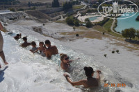 В один из деньков, я поддался соблазну множества отзывов и мы с женой поехали в памуккале. Тур купили напротив отеля в компании Гинза. Стоимость 30 долларов с человека вполне сносная, как мне показалось. Утром выехали в 4.45 от отеля, путь предстоял 370 км туда и столько же обратно. Гид - Наталья, всю дорогу рассказывала нам прозамечательные кожу и текстиль, подготавливая нас к посещению магазинов, от которых видимо имеет откат. Собрала еще по 30 долларов (мы за двоих отдали) за посещение бассейна клеопатры, привезла нас в магазин текстиля в городе Денизли, где мы проторчали полтора часа... офигевая над чудовищными ценами за низкосортные тряпки. Затем, в магазин говенной кожи еще на полтора часа... В общем мы заплатили Гинзе за то что нас проволокли по дурацким магазинам... Само посещение памуккале заняло минут пятьдесят - бегом, бегом... Ничего не успели посмотреть, на 2 минуты кунулись в бассейн клеопатры, театр только издалека сфоткали. В итоге, стоимость у нас за эту поездку вышла высокая, посмотрели мы только барахольные магазины и все устали... Не верьте Гинзе, они разводильщики...