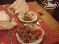 Ужины - только один раз давали крабов, худосочных, но все равно. Остальное время - очень однообразно, в основном курица, тематики не было. Немного говыдины, пару раз была рыда - скумбрия и дорадо, на гриле. Вот почему питание я оценил не по полной, и еще - алякарты, а их всего было два, и оба платные по 5 евро счела, обычно одно посещение дают бесплатно.