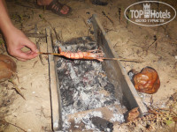 Ходили пешочком по пляжу в Бенаулим и Кавелосим. Бенаулим понравился больше, он сам меньше и цены демократичнее на шмотки и фрукты. Торгуйтесь и воздастся вам! Если просят 800 рупий, то отдадут за 250-300. Ездили в Маргао на утренний рыбный и овощной рынки. Закупались свежей рыбой и креветками и овощами и фруктами. Акула молот 150 рупий за штуку. Креветки в ладонь размером 600 рупий кило. Помидоры 20 рупий кг, манго (не сезон) по 100 за кг. На рынке есть все! На уютной полянке в кустах на пляже пекли рыбу в фольге на углях и жарили креветок в масле с чесноком. Сашими из акулы объедение. Снять шкуру, выпотрошить, натереть солью и полить соком лайма. Выдержать 10 минут, промыть от соли и можно есть с ромом. Сухие кокосы дают отличные угли. На полянке оставлен сюрприз для других отдыхающих.