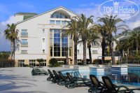 Изначально мы все дружно расстроились, но менять номер не стали (выходя на балкон, смотрели только на право!:)) Заселяли всех в старый корпус, в новом идут ремонтные работы. В номере были халаты (размер 42-48), тапочки, ванно-банные принадлежности, чайник с чашечками, холодильничек, в котором ежедневно пополнялся минибар -БЕСПЛАТНО!!! и конечно же Wi-Fi роутер. Впрочем интернет ловил на всей территории отеля, что было очень важным для нас. Про состояние старого корпуса уже много написано, повторяться не стану, но надеюсь, что скоро и ЕГО очередь придет - ремонтироваться. Сама территория отеля, как уже и было написано- небольшая, очень ухоженная, красивая и зелени вполне хватает .