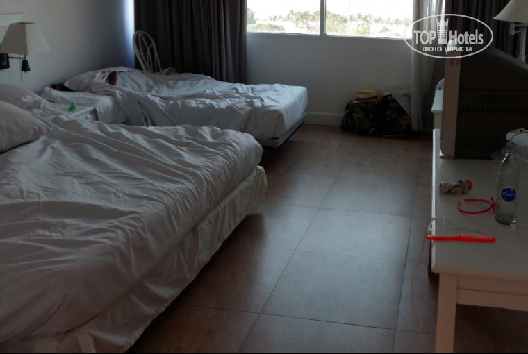 Посчастливилось нам в этот раз побывать аж в трех отелях Паттайи из-за задержки рейса на 2 суток. Из нашего Botany нас переселили сначала в Ambassador City Jomtien Marina Tower Wing 4*, один из отелей комплекса Ambassador, огромное здание в 42 этажа. Расскажу про него. Дали номер на 6 этаже, с видом на море, вид надо сказать хороший,  если бы не грязные стекла, которые видимо вообще не моются, в комнате одна большая кровать с прикроватными тумбами и очень приличная раскладушка для ребёнка,  столик, два кресла, телевизор, холодильник, чайник, гардеробная, кондиционер. Балкона нет, если не ошибаюсь номера с балконом начинаются с 15 этажа. Из банных принадлежностей мыло, шампунь, шапочки для душа, гель для душа почему-то не положили,  полотенца, есть фен. Как только вышли из лифта, было ощущение, что мы в больнице, стены, двери, все белое, присутствует запах сырости. Аналогично в номере, белые стены, белая мебель, достаточно светло, в номере прохладно, как будто за окном не +30, мы даже кондиционер не включали. Кафельный пол,  по которому не очень комфортно ходить босиком, нужны тапочки или носочки. Сантехника старая, но рабочая,  две раковины, душ. В ванной постоянно работает вытяжка, присутствовали мелкие муравьи. Хорошая слышимость, по ночам слышно храпящих соседей. Бельё практически не сохнет, балкончика не хватает.