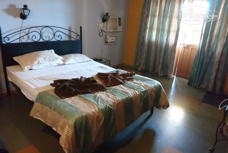 Комнаты. На самом деле комнаты хорошие. Мы жили в главном корпусе, там они вроде все одного типа-студии: кровать (двуспальная или две односпальных в зависимости от типа заезжающих), мини-кухонный уголок с холодильником, странной мини-раковиной и комплектом из двух стульев + стол. Чайника, увы, не было, и нам даже за деньги его не смогли достать, а хотелось бы. В комнате есть шкаф (даже с вешалками), зеркало, 3 маленьких стеклянных стола, телевизор с цифровой приставкой (английские и индийские каналы) и выход на балкон, в котором стоят еще два стула. Нигде нет ни намека на какую-либо сушилку для мокрых после пляжа/душа вещей, поэтому советую элементарно взять с собой веревку и протянуть ее на балконе, нам приходилось все сушить на спинках стульев. Постельное белье чистое, три подушки и даже есть одеяло (во многих отелях только вторая простыня). Кондиционер довольно шумный, режимы настраиваются, но даже спать под ним получалось, ибо без него вообще было не выжить – работал 24 часа в сутки.