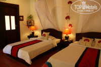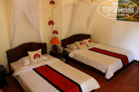 После этого нас отвели в номер. Наше бунгало было вторым по счету от моря. Первое - самое большое, немного в стороне от дорожки, занимала пара с ребенком. Далее следуют несколько бунгало на два номера. С террасой. Перегородка на террасе дырчатая, видно соседей, но нам как-то нечего скрывать, не напрягало. Там еще стоят два деревянных шезлонга, которые раскладываются в лежачее положение под нажимом - красота!)) Номер на-троих. Одна стандартная односпалка и двуспалка. Места предостаточно. Кондиционер - зверь. Далее - дверь в санузел. И вот там меня ждал сюрприз - душ под открытым небом!!! Над душем есть небольшой козырек, если что. А вот над туалетом и раковиной - крыша есть. По поводу душа я шутила, что при дожде -это еще и экономия воды)) Но на наши две недели дождя не пришлось (что странно для Вьетнама) В общем, номер - супергуд. Ближе к дороге есть несколько номеров типа "стандарт" - меньше по площади, нет террасы. Я не любитель таких клетушек.