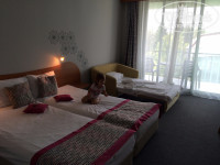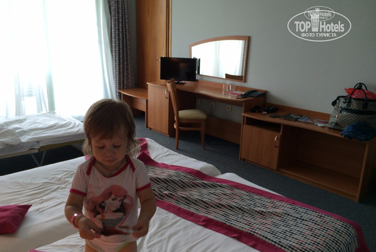 номер был с видом на кафе И соседний отель. В принципе дискотеку было слышно, но при закрытом балконе очень даже было хорошо!) товарищи, пользуйтесь москитной сеткой или покупайте фумигатор!! Нас дико покусали в первую ночь.. номер был хороший, единственный косяк из душа постоянно протекала вода. Не могу сказать, что убирали регулярно, я про мытьё родов и пылесос, кровати заправляли исправно и меняли полотенца. Есть несколько Русских каналов, в том числе и детских!) кстати, в Болгарии все дорого! Берите с собой детские игрушки, карандаши и ведерки из России!))) там мы все в триллионов купили...