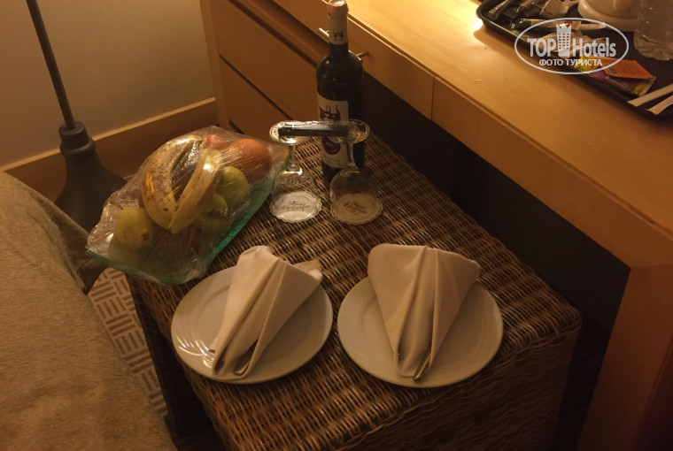 В номере нас ждал комплимент при встрече: бутылка вина и фрукты (заранее заказывала на сайте). Бросив чемоданы, пошли в круглосуточный ресторан на цокольном этаже. Разнообразие еды конечно не впечатлило, но супчик и овощи вполне сгодились для ночного перекуса.