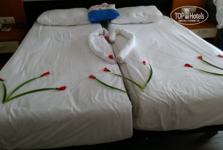 Привет всем. Прилетели в 9.00 в отеле были в 11.00 заселили сразу по нашей просьбе в блоке Д1. Это первая линия , до пляжа 50 метров и с видом на море. Номер хоть и небольшой, но нам понравился. Компактный, но не толкается. Чисто,,ухоженно,весь персонал приветливый. Так как приезжаем второй раз, то нас приятно обрадовали презентом от отеля, фруктами и вином. Суть не в презентации, а в отношении. Прогноз погоды перед приездом не особо радовал, но погода не разочаровала,тучки периодически набегали но без дождя. Купаемся и загорания. Пляж чистый,три пирса, бич- бар работает, нам очень нравится, красивый вид на море и горы. Территория огромная, есть где прогуляться и релакснуть. Море божественное. Питание вполне устраивает.:рыба, птица, овощи и т.д всего хватает, вкусно и приятно. Людей мало, по пляжу видно что заполняемость процентов 30-40.Если решили выбрать это отель,то он вас.не разочарует. Вам понравится. Людмила и Андрей из Минска.