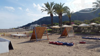 На пляже стоят и бесплатные просто белые навесы-шатры на три шезлонга.