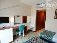 Поехали в этот отель начитавшись отличных отзывов. Поначалу, очень расстроились. Потом решили забить на минусы и отдыхать. Мы в Турции в 4 раз, были в разных 5 и есть с чем сравнивать. Прилетели мы в 7 утра, нас сразу отправили на завтрак, после завтрака сразу заселили. Номер большой, находился в мансарде 6 этаж, окна выходили на крышу и соседний отель. Анимации как таковой не было. Горки работали с 15 до 17 часов в остальное время стояли сухими. Уборка номеров на 3. За 8 дней ни разу не пылесосили, к кровати вообще не притрагивались, даже не заправляли. Все время жадничали шампунь, пустые забирали полные забывали ставить. Каждый день пополняли воду и убирали единственную мусорницу в туалете, на этом вся уборка. У соседнего номера люди выставили грязные фужеры на пол, так они стояли три дня. Еда это вообще отдельная тема. Вообще именно в этом отеле я вспомнила школьную столовую. Кто первый того и тапки. Люди бежали и буквально хапали еду некоторые даже руками. Т.к. многое вообще не пополнялось. Зеленые абрикосы и персики доставались первым, остальным оставались яблоки, апельсины и какой то зеленый, кислый фрукт типа наших ранеток. Помидоры почему то были всегда зелеными, хотя в магазинах было все спелое и в достатке. Клубники не было ни разу, только в виде украшения на сладостях. За 8 дней один раз давали пахлаву, но опять же досталась первым. Мороженное так и не попробовали, заканчивалась слишком быстро. За рыбой и мясо гриль были большие очереди. Мы как то пришли на ужин не в 19 часов, а в 20 часов. Так вообще уже даже и не жарили и готовой не было. Столики то же приходилось занимать заранее иначе не где сесть. Голодными мы не оставались, но каждый раз приходилось есть не то, что хочется, а что есть, что осталось. Персонал разный, есть приветливые, а есть явно недолюбливающие всех туристов. На ресепшене работает Алеся говорит по русски, очень приветливая и доброжелательная. До пляжа ходит маршрутка каждые 5-10 мин. Пляж работает до 18 часов, а маршрутка ходит до 17 часов. Пешком 10мин. ходьбы. Мы иногда гуляли. Пляж чистый, песочек, лежаков всегда хватало. Вкусное пиво и 2 вида вина, газ.вода. Рынки. От отеля вниз до светофора в сторону мечети. На право 1-ый рынок, очень большой, но до него идти 2-3км. А на лево 2-ой рынок маленький идти близко. В целом мы хорошо отдохнули, но в этот отель не поедим. В соседнем отеле то же 5 зв. на ужин были креветки и весь день и часть ночи была слышна анимация. Вывод если вы ни где не были и ни ели ни чего слаще морковки, то вам здесь понравится. А мы не вольно сравнивали с другими отелями Турции, там где отдыхали и этот отель оказался не на высоте.
