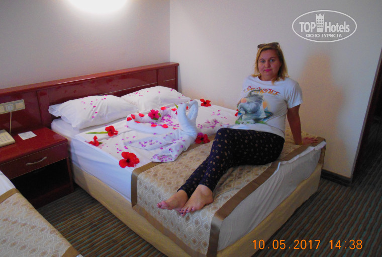 Прилетели в Анталию турецкими авиалиниями,до отеля ехали 2 часа, но время быстро пролетело. Нас встретила очаровательная,приятная девушка Гульнара, всё подробно обяснила про документы и показала територию и где что находиться. Нам сразу дали номер и мы пошли размещаться. Номер был на 1 этаже обсалютно чистый ( 1111 вот такой нам попался),хороший. Мебель и кондиционер новые. Никакого шума не было слышно,ни что не мешало нам отдыхать. Пошли на обед ,еды очень много и довольно разнообразна ( минус один то что ещё не сезон мало фруктов) но всего хватало, Было вкусно и всегда всё свежее. Территория отеля хорошая,чистая ( постоянно убираются) аккуратная есть где погулять и пофоткаться. Очень много бассейнов, 3 горки, лежаков полно, удобный бар на этой территории. Вкусное мороженное давали. Сам отель состоит из 2 корпусов, всё чисто,красиво,уютно посидеть и отдохнуть. Море было прохладное но это не беда. Когда выбирали отель читали что вход в море ужасный,ничего подобного,вход отличный, немного галечки возле берега и всё. А так всё дно это песок. Вот была в том году в Кемере,вот там вообще вход одни булыжники и невозможно было зайти ( и это кстати немного некомфортно было ) Единственный небольшой минус это то что территория пляжа где лежат лежаки маленькая, но мы всегда находили место. Обалденная пицца на пляже. Вечером весёлая анимация как для детей потом и для взрослых. Рядом большой рынок. Вообщем скучно вообще не было. Ездили в Конаклы на выездной базар,кстати немного дешевле местного. Ездили в Паммукале ( честно если ехать то для галочки,красиво, но этих денег не стоит и очень долго. Дорога заняла 12 часов и 3 часа там) Советую кстати там обменять деньги на их местные лиры. А то если на доллары то они округляют. Гульнара нас записала в 2 ресторана аля карт. Вечер провели великолепно. Хочу отметить Менеджера Гульнару как профессианал своего дела,очень добрая,порядочная,искренняя .потрясающая девушка. Во всём всегда помогала. Я рада что нашла настоящую подругу в Турции. Обязательно вернёмся только из за неё и отеля. Она бриллиант этого отеля. НИкогда таких добрых людей не встречала. Вообще турки замечательный народ, улыбчивый и добрые,открытые люди. При выезде забыла деньги в сейфе, всё вернули до копейки. Отель хорош как и для отдыха с детьми,взрослым людям,так и молодым парам. Вообщем советую посетить Турцию и обязательно этот отель!!!! Всё суперррррррррррр! Обязательно приедем туда в октябре.