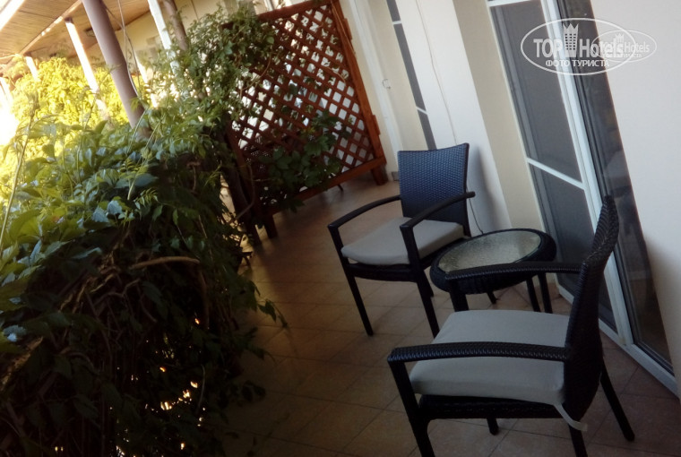 Номера на втором этаже имеют лоджии два кресла и столик с видом на озеро.
