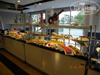 Питание в общем не плохое ,живот ни разу ни у кого не болел. Однообразное.Мужу не наедался. Нам с детьми нормально.Изысков не было,но голодными не ходили. На завтрак яйца,сосиски блинчики с медом и вареньем. Сухие завтраки с молоком .Обед: курица в разном виде; соте из цыпленка,курица,индейка.......Овощи свежие,запеченные ; помидоры,огурцы,кабачки. баклажаны.Фрукты;яблоки красные(вкусные) ,зеленые, апельсины,(после 25 мая) арбуз каждый день.Клубники не было. Большой выбор сладкого.На ужин овощи,курятина, рыба в одном и том же виде каждый день, гриль из курицы и индейки .Один раз готовили печень и говядину с картошкой.Мы жили в отели 10 дней курица ,конечно надоела. Зелени разной много ,разные соусы,маслины,оливки.каперсы . Компоты и йогурты 3 видов.Чай ,кофе из машины ,вполне приличный.Соки порошковые, дрянь ,дети их не пили.В лобби баре для детей делали молочные коктейли. С 16-17 давали мороженое,разное ,вкусное. Днем еды было много и в барах и в ресторане,вечером только спиртное.Даже в баре на улице никаких закусок, только алкогольные коктейли.