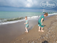 Пляж: В основном песок с галькой, при заходе метр гальки, потом дно песчаное. Дети нормально стоят на песке, потом постепенно глубина увеличивается. Лежаков много, на всех хватает. При ветре цвет моря коричневый от песка, но грязи нет. Когда мы были, море было холодное, но привыкали) Странно что сверху холодная вода, а у песка тепло) Рядом есть развлечения типа парашютов, банана и остального.