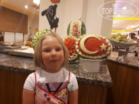 Отдельно напишу, что 2 июня был пожар в спа центре. Мы в это время сели обедать и как раз под рестораном пошел дым. Сначала не много серого была, потом повалил черный дым и всех вывели из ресторана. Видимо горела проводка, т.к. электричество вырубили во всем отеле на пару часов. Даже выбивали окна, чтобы выпустить дым. В главный корпус не пускали, дым был в номерах тоже, но быстро все проветрили. Обедать всех отправили в снек бар, потом переносили туда еду и отправили весь персонал. Как писала выше, от дыма пострадали сладости, но через пару дней уже часть была новой. Думаю все уже обновили. Немного запах дыма оставался при входе в главный ресторан, т.к. там купол высокий у потолка.