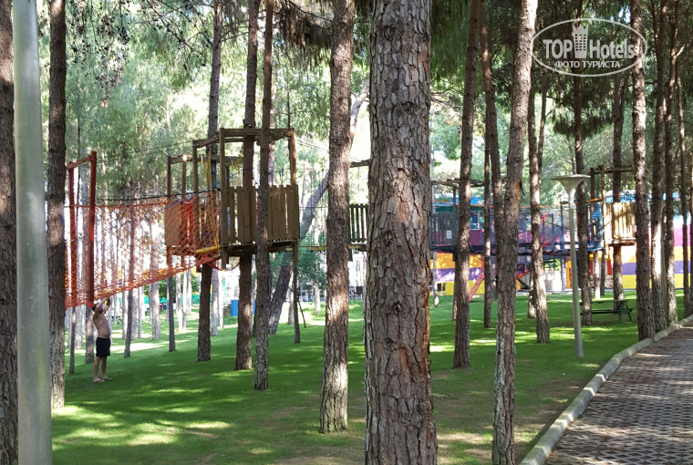 Отдыхаем уже почти неделю. Очень довольны расположением отеля, картинка невероятная, горы, сосны, отличный уголок природы! Заселили быстро, несмотря на ранний приезд - в 9 утра! Номер очень обрадовал размером 38кв(основное здание), отличным видом, отделеным от ванны душем). Уборка среднего качества, плохо пылесосят и протирают мебель, а может и вовсе не делают этого....но зато уборка ежедневная в одно время. В море сделаны волнорезы для комфортного купания, имеется три пирса с которых удобно входить в Море, с берега не комфортно - много острых камней, волунов, есть небольшой участок берега с песком(детский пляж) но там вода не совсем чистая( по типу заводи). Главный и несомненный плюс отеля это его территория, обилие всевозможных беседок на траве и на берегу, где удобно можно расположиться в тени сосновых деревьев, а также наличие различных активных и спортивных развлечений - просто огромный список...целый день проходят тренировки по различным видам спорта, мы посещали тренировки по тайскому боксу, для этого отведена большая площадка полностью оснащенная боксерскими мешками и другим современным инвентарем..на территории есть тарзанка, стена для скалолазания, три спортивные зала "нашпигованных" отличными тренажерами, над отелем натянуты веревки(Не знаю как называется этот атракцион) по которым на приличной скорости можно "пролететь" над всей территорией отеля, для детей построена большая полоса препятствия на деревьях. Теперь хочу поведать о самом грустном и провальном в отеле сангейт - питание!!! Такого слабого питания мы не видели даже в самых бюджетных пятерках, а это наш 15 приезд на турецкий берег...постоянные гости отеля говорят, что питание всегда было сильной стороной отеля и даже в 17 году на новый год, а также в начале сезона все было намного лучше...но отель с началом жаркого сезона решил резко сократить концепцию( то небольшое количество блюд и продуктов расставлено вдоль стен в длинном помещении похожем на лабиринт, а свободное пространство заполнено декором, сам ресторан очень слабо освещен(недопустимо из-за санитарных норм!!!)... фрукты разложены в деревянных ящиках в которые они выгружаются из других грязных(была свидетелем((( нет мяса утром, нет элитных сортов сыра, нет слабосоленого лосося и других морепродуктов, нет черешни, клубники, спелых слив, из фруктов съедобные только арбуз, исчезли помидоры черри... В целом отель поразил территорией и наличием массы активных занятий, но с учетом питания, за данную цену больше не поедем...