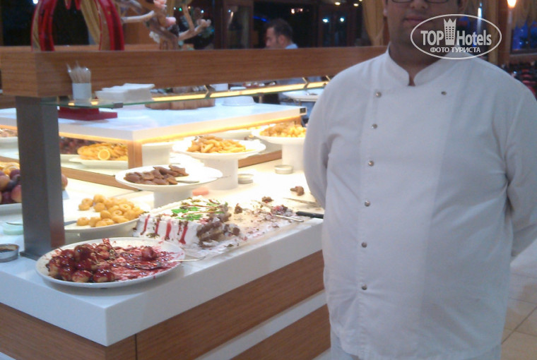 Повара молодцы ! В том числе и те, что на улице (пицца, лепешки, оладьи, индейка на гриле) - мирабА вам из Перми ! )) Яичницу недожаривали (видимо из-за конвеера), но если попросить, то никаких проблем, делают так, как попросишь. Особенно отличился отель (как и повара) в рыбный день Турецкой ночи (сорри за каламбур)))))))) . Вывесили тунца (мясо которого тут же и жарили на гриле), кальмаров, готовили форель, рыбу дорадо и т.п. Было ну оооч интересно и вкусно.