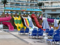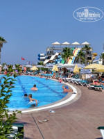 Пляж: возле главного бассейна каменистый, а напротив больших горок песчаный. Во общем кому какой нравится. Мы облюбовали себе каменисты там и людей поменьше и к развлечения поближе. Купались в коралках.