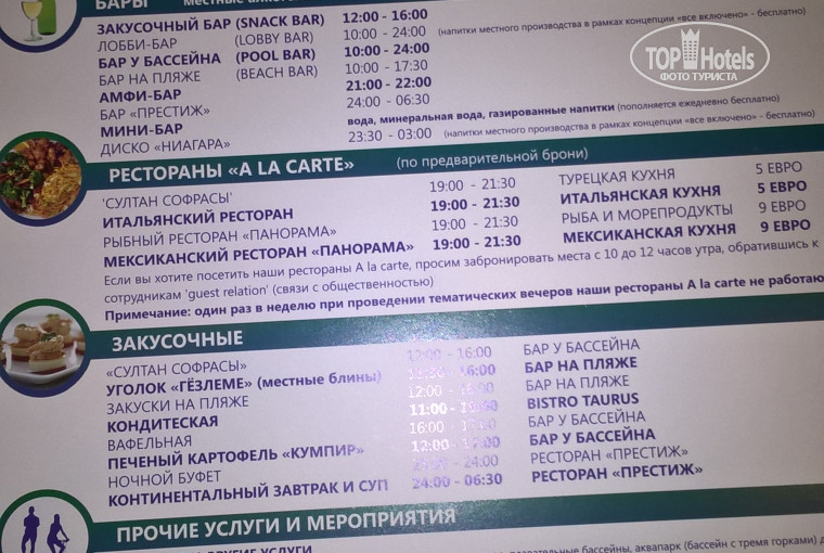 Персонал приветливый. В основном говорят по-русски и еще не устали от туристов. В барах скучно, виски кола, пиво , джин тоник, водка, ракке. В баре у большого бассейна иногда работают бармены, которые могут сделать пару простых коктейлей - джин, водка, два ликера и шипучка, лед и трубочка по настроению. Вино красное, розовое и белое кисловато, им хорошо запивать десертные сладости. Пиво нормальное. Приятно обедать в баре на пляже. Шаурма, картошка фри, овощи, лепешки, пицца. Питание в ресторане стандартное нормальное без изысков, возможно в пик сезона поинтереснее.