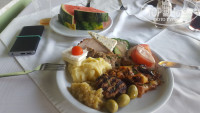 -ресторан отеля имеет 2 зала, разделенных раздачей, один -с кондиционерами, другой -без, двери и окна ресторана все время открыты, терраса прилегает к помещению, по сути терраса и внутреннее помещение-одно целое. Как люди в июле-августе будут обедать/ужинать, я не знаю, нам в конце июня было очень некомфортно находиться там с учетом того, что за 21 день было очень жарко только 26 числа +35, а так +29-+30. Ешь, а с тебя течет и мухи тут же летают и, еще хуже и вообще убивало, курят на террасе, не обращая внимания на детей. Я бы на месте администрации запретили курение на террасе, т.к. у них нет закрытого кондиционированного ресторана, где можно спокойно поесть без запаха дыма и духоты.