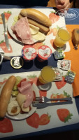 завтрак - йогурт а ассортименте в стаканчике. колбаса, сыр. булочки, порционные джемы, паштет. кофе, чай, сок. яйцо.