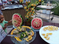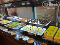 На обед супы-пюре, очень вкусные, рекомендую попробовать! На гарнир в основном картошка, макароны, рис, картошка фри, наггетсы, различные рагу, салатики, овощей и зелени разной предостаточно, всегда была курица жаренная, курица с овощами, постоянно была говядина, телятина, индейка, те, кто говорит что мяса нет или его очень мало, нагло врут. Я за весь отдых никакие гарниры себе не брала, всегда брала мясо в его разных вариациях) макарошки с картошкой я и дома поем, так что здесь ела мясо)) . Различных вкусностей очень много, на фото посмотрите) Я перепробовала всё, т.к. жуткая сладкоежка)) Фрукты были всегда яблоки, апельсины, через день персики, сливы, нектарины, но детки их быстро разбирают, хотя со временем запасы пополняют)
