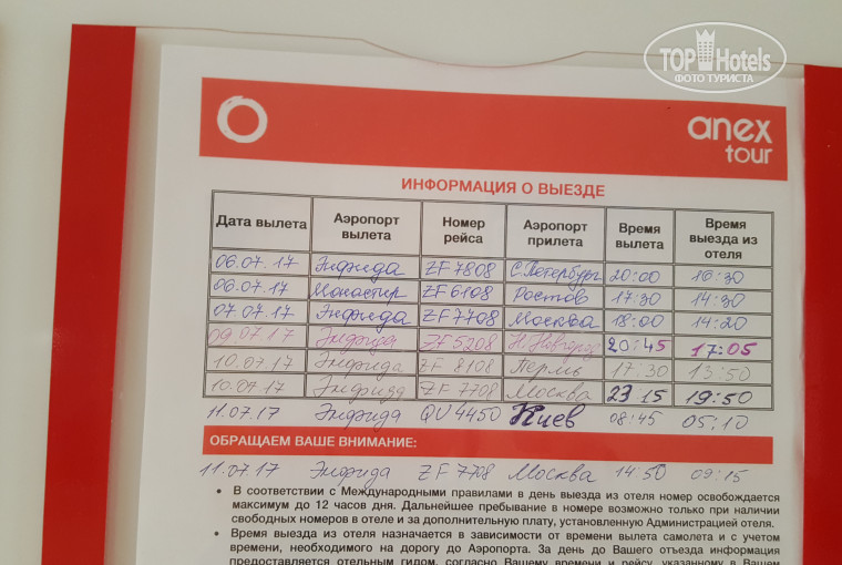 !!! Нас очень подвел представитель от Анекс тура Арина +21629957526. За день до вылета подошли к ней спросили когда вылет, она сказала даст информацию позже. Вечером на доске было написано вылет в 14.50, а выезд из отеля в 9.15! Возмущению не было предела. Утром рано встали, бегом поели, собрались. Еще раз подошли к стенду, инфо такое же. В 9 часов сдали номер и начали ждать автобус. В 9.30 дозвонились до арины, с вопросом где автобус, сказала ждите. В итоге мы провели на ресепшене с маленьким ребенком 2 часа! Арина позвонила Амину в 11 часов и сказала, что трансфер перенесли! Автобус прибыл в 11.15. И гид в автобусе сказала, что знала информацию уже в 15.30 предыдущего дня. В общем вместо того что бы провести утро у моря мы провели его на ресепшене, огромное спасибо Арине за испорченные мнение об Анекс туре. Она даже не извинилась за свою ошибку. В общем совет в такой ситуации ехать в аэропорт на такси. Выиграете время для моря.