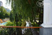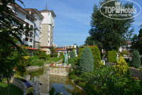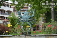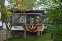 Территория небольшая,но очень уютная и зеленая.Цветы в горшочках,на клумбах,на балконах зоны отдыха гостей и невероятные розы,а также различные оригинальные скульптурки.