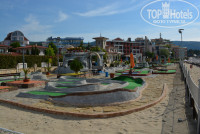По дороге к пляжу слева от мостика находится детский мини-клуб и рядом с ним есть два детских бассейна,вокруг которых пробковое покрытие(впервые такое встречаю),три лежака с зонтиками и детская площадка с батутом.Очень удобно оставтить ребенка в мини-клубе,котрый работает с 10-16,а самим на лежаке с коктейлем или иным напитком отдыхать у бассейна.При желании и ребенок может поплескаться в нем.