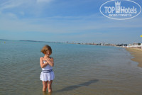 Пляж чистый с мелким песком,бесплатными новыми лежаками с зонтиками чуть левее бара(платный).Вход в море очень пологий и без единого камня.Идеально для детей.