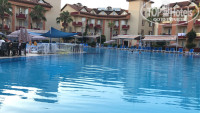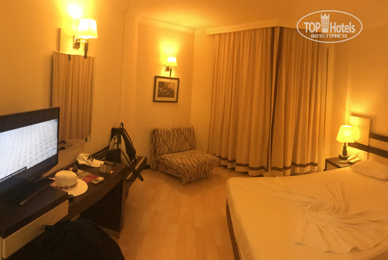 Добрый день! В Турции отдыхала первый раз и сравнивать пока не с чем было. Хочу поделиться своими впечатлениями об отдыхе и отеле. Покупали с молодым человеком путёвку в этот отель от Тез Тура, сразу скажу, что с перелетом нам не повезло. Летели с iFly, самолеты в плохом состоянии, рейс задержали с 02:30 до 18:40, хорошо хоть в онлайн табло показывали изменения и мы сразу в аэропорт не поехали, но переносили время рейса раз 10!!!! В отель нас заселили около часу ночи, день отдыха мы потеряли( К сожалению, нас не покормили по приеду, хотя этот день у нас был оплачен. Номер был в 1-м корпусе на 2-м этаже 1209. Вид был на бассейн, что нам очень понравилось, да и в целом номер хороший. Видно, что все уже немного старовато, но состояние мебели и сантехники было нормальным. Для тех, кто привык отдыхать в 5-ти звёздочных отелях, с огромными номерами, чтобы все было "дорого-богато", номер конечно будет простым. Но каждому своё, как говорится. Территория хорошая, для детей десткая площадка и постоянные развлекательные программы. Для взрослых из анимации только водное поло, аквааэробика, волейбол на пляже(и то, мяч от отеля был плохой, а под конец нашего отдыха так вообще куда-то пропал, поэтому мой совет возьмите свой мяч, если планируете играть. А так на площадке соседнего отеля всегда кто-то да играл, поэтому не проблема к ним присоединиться), была ещё дискотека в отеле, но музыка там так себе. Два-три раза вывозили на дискотеки за пределы, какие-то были платные по 10$ вроде, и была ещё бесплатная пляжная пенная вечеринка, но мы на неё не попали т.к улетали в этот день. Кормят вполне себе вкусно, но разнообразия большого нет. Из фруктов всегда был арбуз(вкусный, красный,сочный), дыня(зелёная и безвкусная), персики(тоже не очень), нектарины(когда как попадались, иногда вкусные иногда нет), сливы(на вкус отвратительные), и апельсины. Разговарились с женщиной в последний вечер, она жила в соседнем отеле Orfeus Queen Hotel, и по её словам, питание там было лучше и выбор был больше. До пляжа и с пляжа ходила маршрутка, но мы один раз на ней проехали, потому что ходили всегда пешком. Идти до пляжа ну минут 6-10, в зависимости от темпа ходьбы. Очень вкусные коктейли за 3$ из фруктов. На пляже в 11 можно было поесть лепешки местные,они вкусные с разным наполнением(шоколад,картошка, и что-то вроде сыра), но очередь за ними выстраивалась большая. В итоге за 11 дней, что отдыхали там, смогли 2 раза взять попробовать эти лепешки. В отеле особо буйных и пьяных не было, после 12 старались особо громко не шуметь. Уборка в номерах поверхностная. Оставили записку и 1$ на кровати с просьбой поменять постельное белье, после чего доллара не было, а простынь была старая. Отель хоть и простенький, но уютный. Так же в отеле много немецев отдыхает. Без проблем можно доехать до соседних городов Сиде и Магавгат на маршрутках, проезд стоит 4 лиры, если не ошибаюсь. За пределами отеля есть в 10 минутах базар небольшой и супермаркет, в другой стороне от отеля в 20 минутах большой базар.