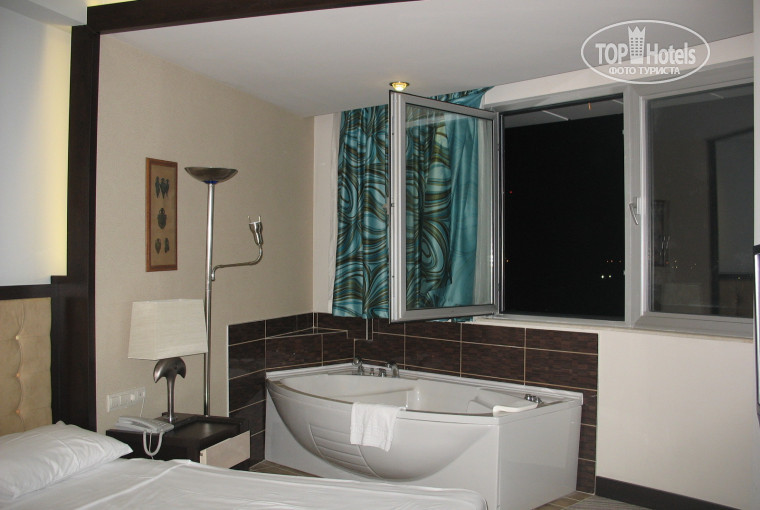Комната – Всё новенькое, чистое, мебель ещё пахнет стружкой(хотя это как раз не самое приятное) НЕ большие проблемы с сантехникой – я не знаю кто им продал такие краны для раковин , но по удобству я бы не дал и тройки, кроме этого в свите тёк душ в джакузи и вода не спускалась в дополнительной душевой кабинке, но всё быстро починили. Может мы были первые клиенты в этой свите, тогда простительно. В каждой комнате бесплатный сейф, есть балкон, ванна.