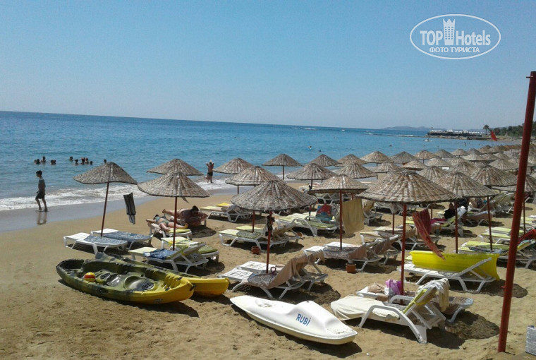 Самое главное в этом отеле пляж и море! Это фантастика. Ради этого можно на все-все остальное просто закрывать глаза. Чистейший гладкий песок, ни травинки, ни соринки. Долгий, пологий заход. Рай для детей и взрослых. При выходе из отеля мы всегда купались правее, заметили, что во второй половине дня там вообще нет людей, до пяти человек в море плавало, очень здорово. Лежаки занимать мы не спешили, за первым рядом не рвались, утром и вечером всегда хватало. Зонтики удобные, от солнца закрывают) Полотенца выдают по картам у крытого бассейна в СПА-центре, удобно, всегда чистое и сухое полотенце у тебя с собой, не носить песок в номер.