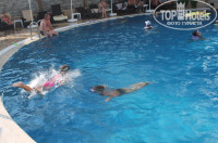 Открытый с видом на море. Глубина его от 1,5 до 2,10, не слишком большой, но понырять и поплавать можно. Детский совсем лягушатник, см 20 всего, наверное. В принципе для детей постарше можно было сделать поменьше глубину основных бассейнов. В 1,5 м даже я не могла постоять, приходилось только висеть, держась за бортик.