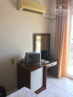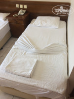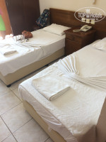 Номер: нам попался убогий, со страшными дверями ванной, с потолка в ванной немного капало. Но при этом все работало. Вода горячая, холодная целый день без перебоев. Кондиционер. Мини бар, в котором по приезду лежали 2 бутылочки с водичкой. Старый телевизор. У нас номер был на третьем этаже с видом на море) что было огромным плюсом, который перекрывал убогость номера. Мебель очень старая, но на кроватях лежат хорошие ортопедические матрасы, видно новые. Белые полотенца отельные настолько выстиранные, что получились серого цвета, мы ими не вытирались, т.к. взяли по полотенцу с дому, зато эти брали с собой на пляж и стелили на лежаки (что разрешено отелем).