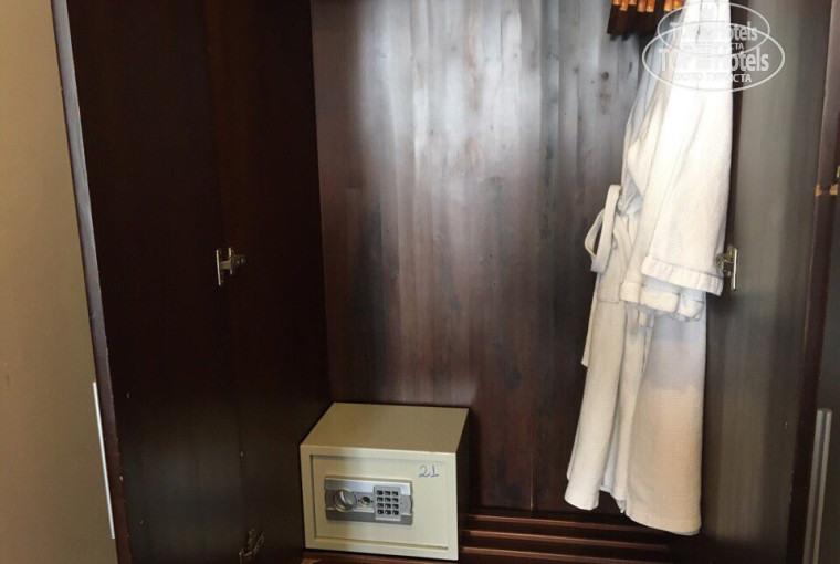 В номере есть фен, холодильник, телевизор, чайник, плечики в шкафу, тапочки, халаты, сейф (который почему-то открывался только с 15 раза).