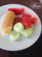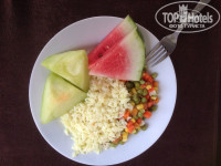 Что касается питания, то оно хоть и All Inclusive, но до своей планки не дотягивает, потому что выбирать не из чего. На завтрак с 8 до 10 обычно были пустые круасаны или булочки с вареньем из розы, мюсли, помидоры и огурцы ( вялые, жесткие, с белыми прожилками), нарезанные сосиски ,колбаса очень низкого качества, плавленый сыр, яйца, белый и серый хлеб, персики, арбуз (дольки обычно очень тонкие), дыни (совсем зеленые , вялые и безвкусные). На обед (с 12 до 14 часов) часто предлагался рис (единственное, что я всегда брала с удовольствием), вареные зерна кукурузы в масле, салаты с яйцами (которые утром не доели), с помидорами, с огурцами, пирожные, мороженое, много разного мясо (как вкусного, так и не очень, тут уж как повезёт), печенье с ярко выраженным вкусом средства для мытья посуды. Изредка бывала рыба в ограниченном количестве (если вы пришли поздно, то рыбу не застанете, её больше не принесут). На обед были и супы, но вид у них был такой, что даже пробовать не хотелось. С 16 до 18 в лобби-баре можно было взять закуски, например пиццу, единственной начинкой у которой является лук( !), иногда правда бывала более-менее съедобная пицца, нарезанные апельсины, всегда на обед и полдник было порошковое безвкусное мороженое в дешевых вафельных стаканчиках. Также в лобби-баре можно было попросить сладкую воду типа Спрайта, но наливать её может только бармен, которого почти никогда нет за стойкой. За несколько дней до отъезда на завтрак в автомат с водой залили воду из-под крана, судя по вкусу (Хлорка? Или они так плохо стаканы помыли?). Невкусную пиццу с полдника несколько раз относили на ужин, а арбузы и вареные зерна кукурузы иногда лежат в готовом к потреблению виде по нескольку дней, из-за чего съёживаются и теряют свой вкус. Была и хорошая еда, но такой было мало, к тому же её быстро разбирали. Многие тарелки мне попадались с отбитыми краями.