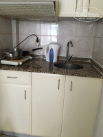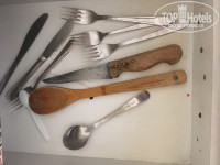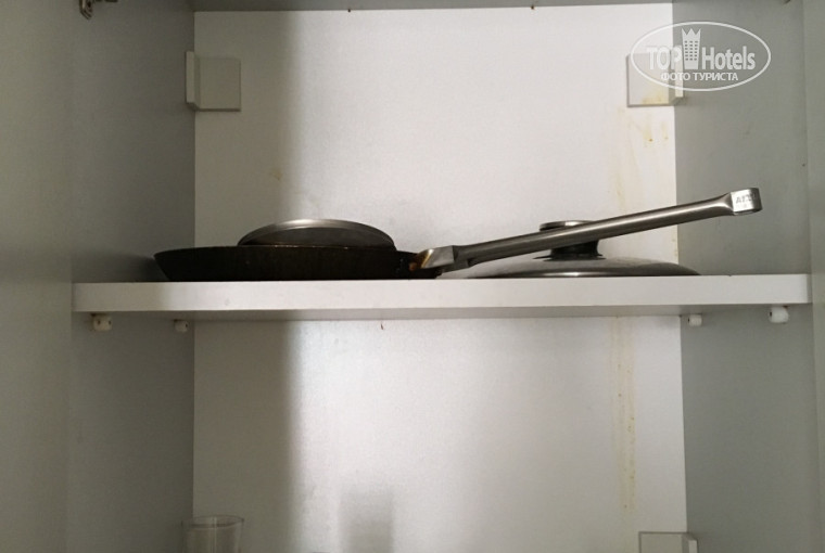 Кухня так себе оборудована.. одна кружка маленькая, три стакана стеклянных без ручек (чай из них не попьёшь, горяче ж), две тарелки, какие то приборы, нож тупой, страшненькая сковорода и кастрюля. Плита еле "дышит", 30 минут варила яйца, не считая времени подогрева воды, вода так и не закипела..