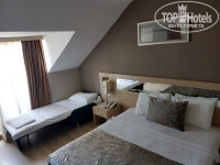 Угловой номер нестандартный, заметно побольше и с нормальной односпальной кроватью для ребенка. Но какой в нем толк, если все окна зашторены, балконы - это имитация, даже полотенца не повесить. А окна ночью не открыть, потому что выхлопные газы и шум от автобусов постоянно и прямо в окна идет.