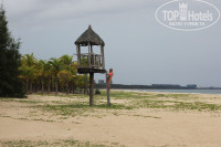 До пляжа от отеля минут 5-7 ходьбы, очень даже недалеко. Пляж песчаный, сам песок достаточно чистый и рассыпчатый. На пляже есть грибочки с деревянными лежаками, но их не очень много, штук 20 максимум. Мы отдыхали в "не сезон", поэтому со свободными лежаками обычно проблем не возникало. Но в один из дней, когда была особо пасмурная погода, пляж был забит китайцами, и все лежаки были заняты, но мы нашли выход из этой ситуации. Нужно по территории пляжа идти минут 7-10 направо в сторону "маяка", там ближе к растительности (пальмам) есть свободные лежаки и "зонтики-грибочки", не такие конечно новые как на территории отеля, но разместиться там тоже можно. Мы так и не поняли, чьи это лежаки: какого-то из отелей или самого жилого комплекса Алоха, но людей там было очень мало, пару китайцев. Мы туда отправились прямо со своими полотенцами. Как ориентир - там рядом есть полуразрушенная спасательная деревянная вышка. Море кстати в этой части лучше даже, чем на пляжной территории отеля, и меньше мусора и водорослей. Побережье достаточно чистое, нет битого стекла, иногда конечно встречаются пластиковые бутылки и окурки (китайцы курят и бросают бычки прямо в песок), но его быстро убирают. На пляже после отлива можно встретить гряду выброшенных на побережье водорослей, от этого никуда не уйдешь. В "не сезон" море достаточно не спокойное, в один из дней нашего отдыха были высокие волны, купающихся прямо относило волной в море, очень сильно намывало песок. В другие дни море было поспокойнее, мы свободно купались. Море тёплое и прозрачное, на глубине видно даже свои ноги, когда нет волн. Водоросли в воде тоже встречались через день, иногда даже не хотелось из-за них купаться. Солнце в безоблачную погоду очень активное, можно легко обгореть, поэтому лучше всего лежать в теньке под грибочком и загорать либо с утра до 12.00, либо после 15.00. Мы по пляжу часто гуляли направо пешком в сторону маяка до места, где в море впадает речка Цзи (вроде так она называется). Минус данного места - это мошки, они очень кусачие, особенно когда нет солнца, они не просто кусают, и грызут кожу. В номере есть специальный спрей от них и фумигатор, лучше всего с собой в поездку брать мазь, спрей для защиты от насекомых и средство от укусов. У меня ужаная аллергия на укусы сибирских насекомых, часто чешусь и на месте укусов появляются сильные волдыри. А там к великому моему удивлению я ни разу не воспользовалась спреем. В общем, у всех всё по-разному: у кого-то сильно чешутся укусы, у кого-то нет. Ко мне Хайнаньские насекомые были благосклонны, аллергической реакции не наблюдалось, однако мы успели сгореть и облезть как ящеры, поэтому с солнышком лучше не шутить. При выходе с пляжа есть душ и полоскалка для ног рядом с туалетами, чтобы обмыться от песка, что очень удобно.