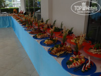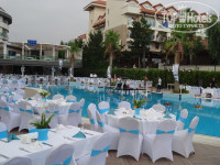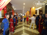 Питание очень хорошее! Из фруктов: черешня, арбуз, дыня, яблоки, бананы, апельсины, несколько видов винограда, персиков, абрикосов, изредка – манго и клубника. Торты как на заказ у нас, пирожные, желе и пудинги очень-очень-очень вкусные, и вообще много разных десертов: запеканок, печёных фруктов, пахлавы и т. д.! Очень много овощей и блюд из них, приготовленных на гриле, в духовке, обжаренных и просто сырых. Из мяса: индейка, говядина, телятина, курица, ягнёнок… Каши есть, супы, особенно понравился национальный суп. Два раза был говяжий язык – очень вкусно приготовлен! Печень изумительно готовят! Много салатов и заправок к ним! Креветки только в салате. Мидии с овощами, кальмары на китайской кухне. Рыба всякая и каждый день. Пробовали разную, в восторге от чупры и форели на гриле под соусом. Есть детское меню, детский стол. Много всяких закусок, сыров, колбас… Был мёд в сотах каждый день. Недоеденное официанты сразу скидывали в баки с пакетами. Не видели, чтобы кто-то болел, даже из детей (к сообщениям в прессе о ротавирусе и Коксаки!)! Еда – круглые сутки! С 7:00 завтрак и далее до 23:00, когда действует специальное меню! Если не хотите идти в ресторан днём, то на пляже с 11 часов пекли гезлеме, с 12 ч – пиццу (вкусная!), пекли вафли, делали хот-доги, возле бассейна тоже, постоянно было мягкое мороженое в вафельном рожке шести видов (разное у бассейна и на пляже), и мороженое пломбир в шоколадной глазури нескольких видов в упаковке, были фрукты, печенье, десерты, слойки разные, булочки и закуски. Поразила чистота, убирают в перчатках. Каждый день посвящён чему-то, поэтому было разное меню: то Турецкая ночь, то Китайское меню, то Гала-ночь… Несмотря на 70% немцев в отеле (как сказали на ресепшене), мы различий в обслуживании не почувствовали совсем. Так же желают приятного аппетита, приносят напитки, забирают посуду. Утром свежевыжатый апельсиновый сок. Вино (красное, белое, розовое одной марки) не понравилось нам совсем, муж сказал, что пиво «Эфес» – более менее… В баре не пили – о качестве алкоголя не знаем. На ужине были алкогольные и безалкогольные коктейли по одному виду, приятные! Есть три ресторана – турецкий, рыбный и итальянский – их можно посетить по одному разу бесплатно.