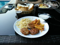На завтраки и ужины ходили в отель Parus. Наш новый отель располагался рядом, поэтому трудностей нам это не доставило. Завтраки были всегда одинаковые. В тарелке нарезанные огурцы, помидоры, 2 кусочка сыра, кусочек колбаски, сморщенные оливки, вареное яйцо, хлеб и арбуз или дыня, ну и чай еще был. На ужин всегда разное, но тоже все в тарелках (не шведский стол). Были овощи, гарнир, иногда мясное. Супчик иногда дополнительно бывал. Вечером чая не было, была только вода 0,5л на человека. Все вкусно, съедобно. Ужины и завтраки, в принципе, нам нравились. В последний вечер на ужин подали аж 2 рыбы жареные, вкусные.
