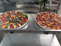 Жили в центральном корпусе Делюкс. Отель отличный, еда разнообразная.Каждый день рыба,мясо, фрукты,зелень,салаты,сладкого очень много. Повара всегда что-то придумывали,То вынесли с феерверками огромный торт мороженное (очень вкусный!!!), То вывесили огромные рыбины и готовили из них.