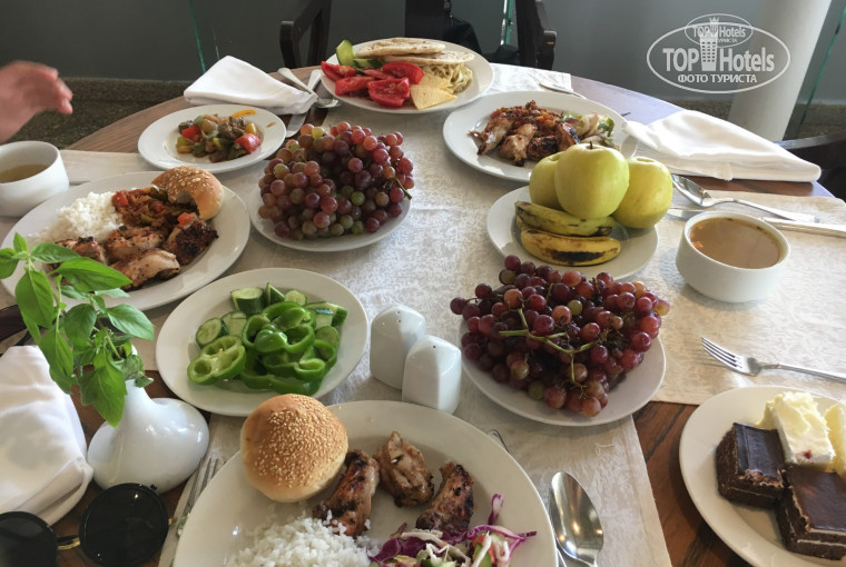 Так как приехали отдыхать, с молодым человеком решили обращать внимание только на плюсы) они были )) красивая теретория, ухоженная ) спасибо тем людям которые за ней ухаживают. Так как жили в жопе, пока шли на завтрак то смотрели на эту красоту. Завтрак не густо. Молодой человек в Египте уже был так что была готова к их количеству и качестве еды. Кушали только омлет, с утра особо мяса не подавали только сосиски (которые сделанные как будто с туалетной бумаги). Завтрак для меня был ок. Обед и ужин получше. Рыба или курица на мангале, тунец или баранина. Десерты действительно вкусные, фруктов было мало: дыня, яблоки, груша, виноград. Набрали с собой кучу таблеток от отравления, но нам они не пригодились. Уже под конец узнали что некоторые отдыхающие все таки отравились. Рестораны: мы не ходили не в один. Кто был говорили что фигня и ходить не стоит.