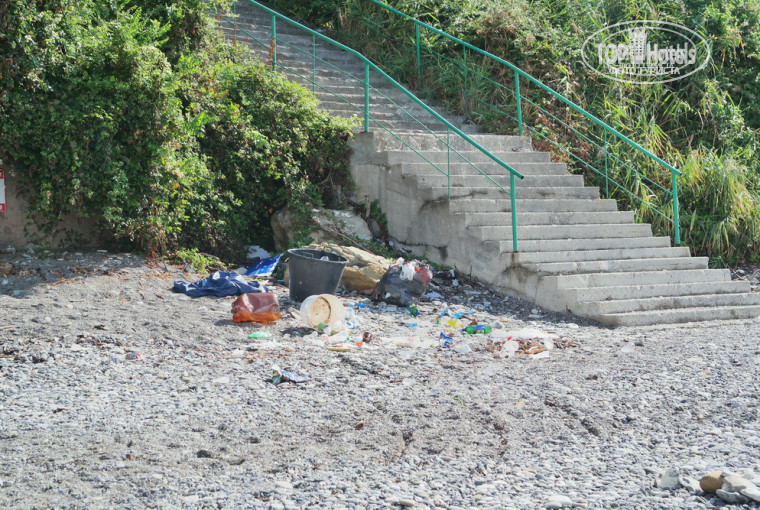 На пляже ужасный туалет, с ребенком не пойдешь, поэтому приходилось ходить в номер. В двух шагах от этого ужасного туалета жарят шашлык и сидят за столиками, короче сплошная антисанитария. Зонтов на пляже нет, есть не большой навес, но места под ним свободного нет. Так что, если не хотите обгореть зонт берите свой . Спуск к морю, а тем более подъем это отдельная история. Вначале 230 ступенек по крутой лестнице, а затем по извилистой дорожке все в гору и в гору, лишний раз спускаться к морю желания нет, а если вы еще с ребенком и с коляской для вас проход к морю закрыт, пандусов там нет нигде. Спасателя видели за 10 дней только один раз.