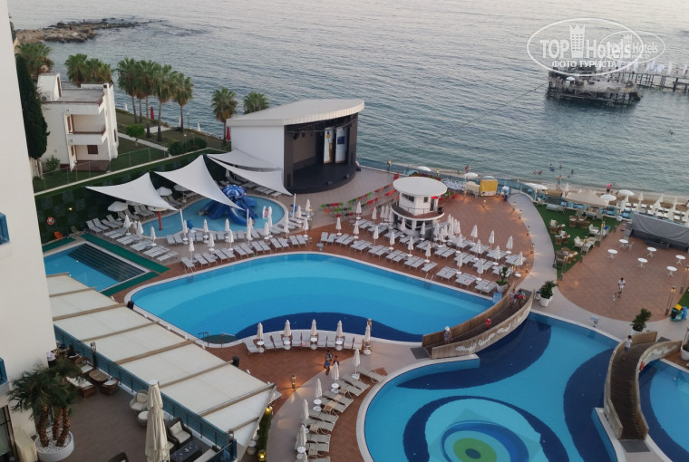 отель нам очень понравился все очень красиво сделано со вкусом . Единственное что нам не очень понравилось это вид из номера . Мы специально брали номер с видом на море стоит дороже чем обычный а в итоге нас вселили в номер с боковым видом на море . Конечно здесь можно долго дискутировать насчет вида на море так как стена с балконной дверью стоит под углом в 45 градусов и если смотреть с дверного проема вперед то получается прямой вид на море . Но если выйти на балкон и подойти к перилам то прямо перед тобой открывается вид на противоположную сторону отеля.