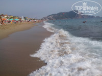 7. Пляж восторга не вызвал, серый песок липнет к телу, а у входа в море начинается галька - в сочетании с налипшим песком делает вход в море весьма неприятным. Но это всего несколько шагов, которые можно перетерпеть, если едешь ради моря и анимации. Если хочется нежного песочка, лучше ехать в Аланью на пляж "Клеопатра" - минут 15 на маршрутке номер 50, остановка возле нашего отеля, цена $1,5 или 5 турецких лир (в лирах дешевле) с человека, дети бесплатно. Но на Клеопатре шезлонги и зонтики будут платными (мы не брали, ездили поваляться на песке).