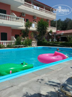 Когда добрались, поняли, что Фламинго - это нечто вроде оазиса в пустыне: очень много зелени, само здание очень приветливое благодаря своему цвету, великолепный бассейн, который так и манил в него прыгнуть еще до официального заселения, прекрасные люди: малышка Мелина, которая с таким очарованием предложила нам передохнуть, выпить воды, сока, что я сразу поняла - здесь нам будет комфортно и хорошо. Так и вышло. Номер у нас был замечательный: всё новое, очень чисто, есть сплит-система на случай зноя (редко пользовались), прекрасная кухонная зона, ванная без плесени, грязи и прочего - всё новейшее. Уборка в номере проводилась тщательная (2 раза в неделю), вплоть до расстановки в красивый ряд пузырьков и баночек на полке :D Пока мы там жили, со всеми познакомились - Дорой - хозяйкой апартаментов, очень отзывчивой женщиной, её мужем Василием, детьми Мелиной и Пабло, собакой Ники - и чувствовали себя действительно как в гостях у наших старых друзей, а такие "гости" можно считать вторым домом. Насчет питания: у нас в путевку был включен только завтрак, которого было вполне достаточно. Он собой представлял яичницу с овощами, ветчиной и сыром. Вкуснейший свежий хлеб привозила Эми, помощница Доры (она как раз проводила уборку в номерах, её можно было часто увидеть на территории отеля, попросить о чем-то). Наши друзья брали ужины, в которые входило мясо, овощи, паста. Порции большие, всё свежее и вкусное. На десерт подавали фрукты. С питанием проблем не было, как и со всем остальным: информацию о магазинах, расписании автобусов, расположении достопримечательной и т.д. можно узнать у Доры. Даже, если вы забыли защитный крем от солнца, он там есть!! :) Кстати, прочла, что остановки в километре...неверная информация. Напротив Фламинго есть остановка (у здания муниципалитета), там ходят автобусы в Керкиру и другие направления по расписанию (+25 минут, т.к. они выезжают из Кавоса - деревни, что подальше от Мораитики, это я также узнала от Доры).