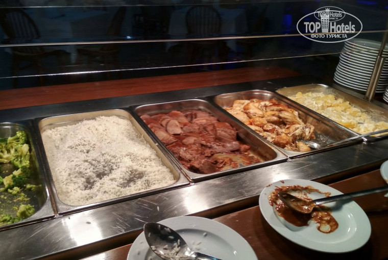 Наше приключение началось с того, что когда зашли в WC на нас упала крышка от ящика с полотенцами)))Все дружно поржали и подумали , что нас ждет дальше. А дальше был обед "всё включено" ! К сожалению , за последние восемь лет сколько мы ездим - мы были в шоке первый раз, на обед нас ждали 4 подноса с горячим (и гарниры и мясо) , а так же один салат и огурцы с помидорами из фруктов были яблоки и груши. Ужин, к счастью, был по богаче(7 подносов и это максимум в этом отеле). И так семь дней...
