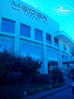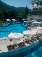 Территория отеля. Бассейн большой, вода уже была прохладная. Шезлонги не для пятерки конечно. Парковой зоны практически нет. Типичный городской отель. На территории отеля не очень чисто. Грязную посуду убирают, а вот столы протирают один раз ночью. Если кушать в баре возле бассейна, то осы одолевают. Еда возле бассейна не очень вкусная, брали там только фрукты и мороженое с 16 до 17 часов. Но мы возле бассейна были мало, так как предпочитаем море.