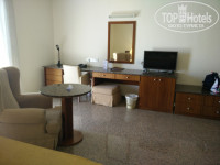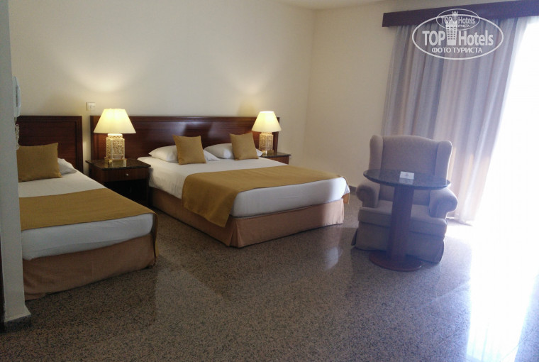 Итак, долетели авиакомпанией Россия вовремя, без задержек. В 9.00 уже были на месте. Заселение, как известно, в 14.00. Всем туристам, кто приехал вместе со мной на автобусе в этот отель, сразу предложили позавтракать, что мы с радостью и сделали). Потом я переоделась (раздевалка внизу, рядом с тренажерным залом и крытым бассейном), взяла пляжное полотенце (депозит 5 евро) и пошла на пляж. Вернулась к 11.00 и сразу получила ключ от номера (карточка) и адаптер (депозит 3 евро). Номер находился в соседнем корпусе, на 5 этаже, с видом на кусочек моря (вторая линия все-таки). Я бронировала номер Superior, а мне достался Family Room со всеми вытекающими приятными моментами, а именно: просторный, с балконом, холодильником, халатом/тапками, чаем/кофе/сливками в изобилии, утюгом и гладильной доской, большой очень удобной кроватью (была еще одна кровать, но мне хватало большой двуспальной))). Каждый день производилась добросовестная уборка, менялись ежедневно полотенца, пополнялись запасы шампуня и геля для душа, а также, пакетики чая, кофе и сливки. Я ничего дополнительно не оплачивала, включая пользование холодильником. Единственный минус-отсутствие сейфа. Вернее, сейф был в номере, но пользоваться им было нельзя. Предложен был сейф на ресепшн, я не брала.